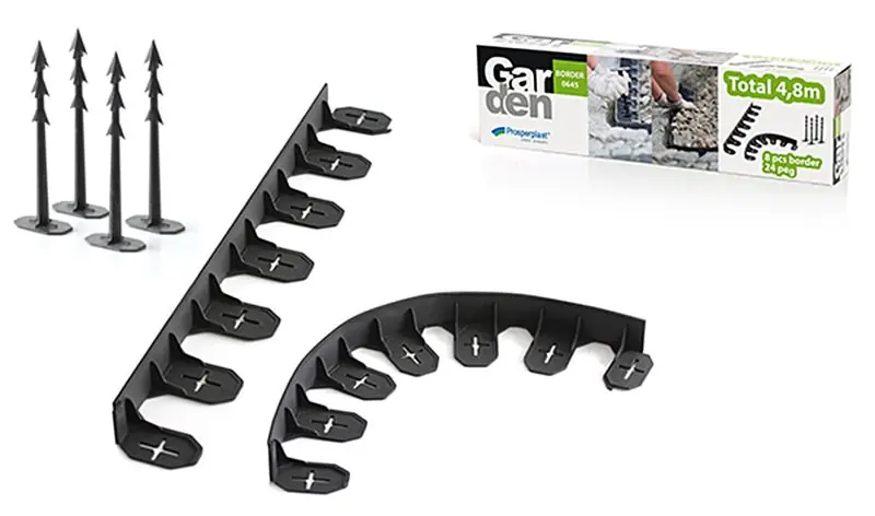– din material flexibil, modelabil – inaltime 45 mm – folosire: – previne creșterea excesivă – ideal pentru separarea gazonului de patul de flori – ușurează tunderea gazonului – inclusiv 24 de știfturi de fixare
