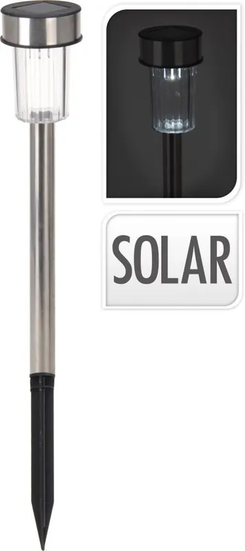 solar, oțel inoxidabil, diametru 4,5 cm, lungime totală 36,5 cm, reîncărcabilă, se reîncarcă în timpul zilei și în amurg există o fotocelulă încorporată, se aprinde automat, bateriile se încarcă timp de 8-12 ore în lumina normală a soarelui, în întuneric lampa strălucește timp de 6 ore, amestec de LED-uri albe calde și reci