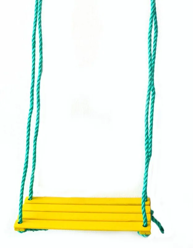 din lemn, dimensiuni scaun 40×15 cm, greutate max 35 kg, snur rezistent din polipropilena 1 cm grosime, la capatul cordonului inele metalice pentru agatat leagan, colorat.