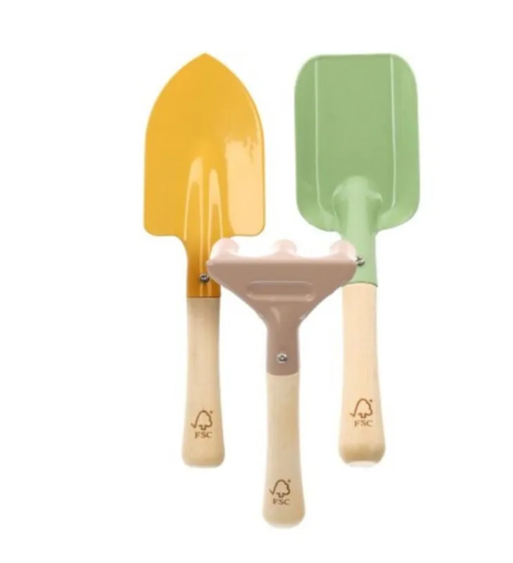 scule de gradina copii, metal, maner din lemn, set 3, cazma 21 cm, grebla 15 cm, lopata 20 cm culori mixte