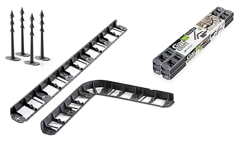 – realizat din material flexibil maleabil – inaltime 45 mm – folosire: – previne creșterea excesivă – ideal pentru separarea gazonului de patul de flori – ușurează tunderea gazonului – inclusiv 28 de știfturi de fixare – datorita intaririi plasticului, forma dreapta se mentine usor