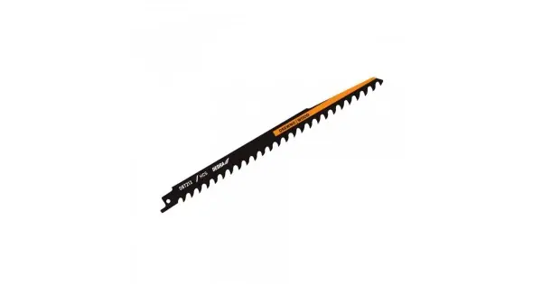 Lama de ferăstrău sabie pentru tăierea lemnului grosier DEDRA 08T213.Este proiectat pentru tăierea lemnului, a lemnului de foc și a lemnului umed (15-190 mm). Lama are o lungime maximă de 240 mm, iar lungimea de lucru este de 215 mm. Fabricat din oțel cu conținut ridicat de carbon HCS. Tăierea eficientă este asigurată de suprafața de tăiere special pregătită, și anume dinți șlefuiți cu un profil bifurcat și o densitate de 3TPI (3 dințipeinch).Date tehnice: